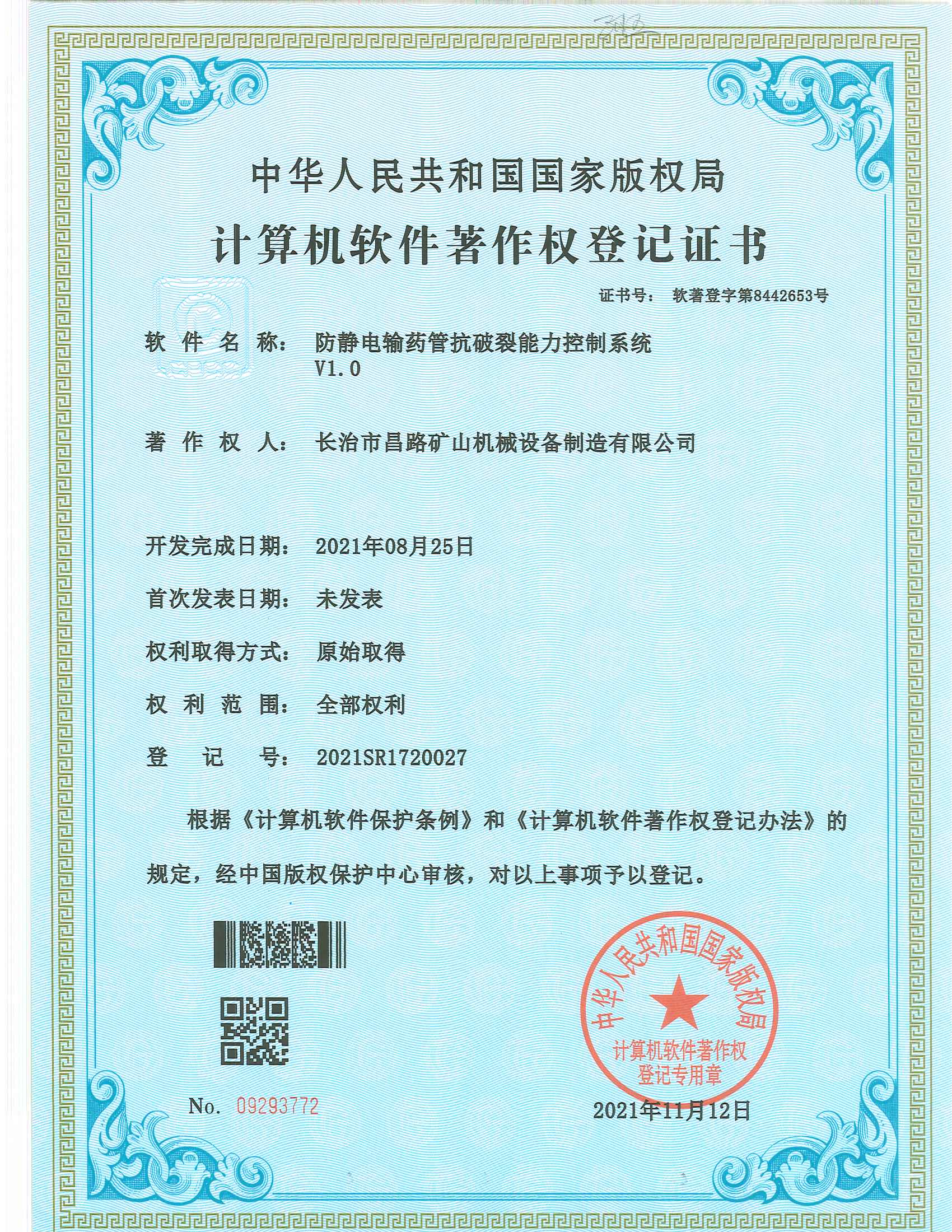 防靜電輸藥管搞破裂能力控制系統著作權登記證書