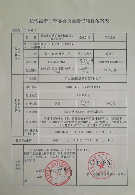 長(zhǎng)治高新區(qū)管委會(huì)企業(yè)投資項(xiàng)目備案表